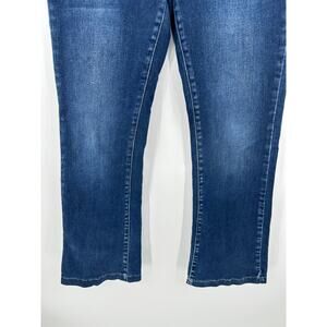 Dark wash blue denim bootcut wide leg cotton blend jeans.