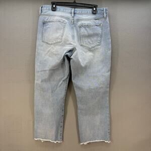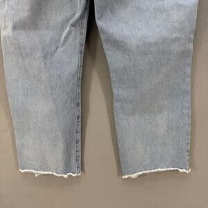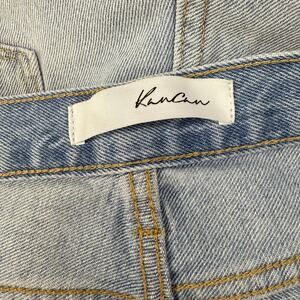 KanCan Women's Denim Jeans. Blue in color. Light denim wash. Tagged size 13/30. These women's KanCan jeans feature a five pocket design, a wide leg with raw hem, factory distressing, and a high rise fit. Style number KC7902L. In preowned condition with minimal signs of wear.