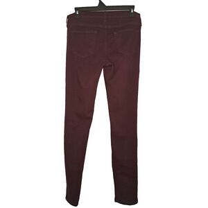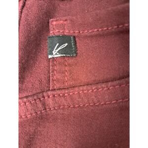 The product is a pair of Kancan Jeans in Women's Size 11, featuring a distressed burgundy color. These skinny jeans have a mid-rise fit with a 5-pocket design and button accents. Made of denim fabric with a distressed wash, they are suitable for all seasons and are machine washable. The jeans are accented with a whimsigoth rock theme, making them a unique and rare addition to any wardrobe.