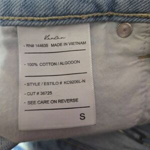 Details: high Rise, light wash, factory distressed and raw hems, no stretch, zipper fly
