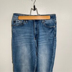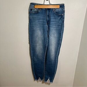 Good condition, some wear at thigh as shown; could make great cut offs. Kancan. Maria High Rise Ankle Skinny Jeans. Medium Wash. Our Maria jean comes in a medium wash with light whiskering and distress at the hem. Its staggered raw hem gives it a hip edge that's both trendy and modern. Pairs well with white tees or your favorite pair of booties. Regular 5 pockets, Single button front closure, Zip fly. Style KC7329M. Size 9/28. Waist 13” Inseam 27” Front Rise 10”. All measurements are approximate and taken lying flat. Smoke free home. No trades, offers welcome.
