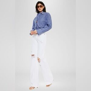 Our Montana Ultra High Rise 90's Flare Jeans features a wide leg style, that tapers from the thighs and flares out to the legs. All styles come lightly distressed at the thighs, pockets, and knees for a worn-in look. Our ultra high rise sits comfortably on the naval. Made from our non-stretch denim that is durable and won't loosen from daily wear.