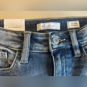 Kancan Signature Woman's Mid Rise Ankle Skinny Jeans in size 24, featuring a solid blue denim fabric with a medium wash. These jeans have a zip and button closure, distressed accents, cuffed hems, and a 5-pocket design. Made of cotton, they have a regular fit and a mid rise. The style is a blend of bohemian, city, and 90s themes, perfect for all seasons. The jeans also include logo accents from the Buckle product line.