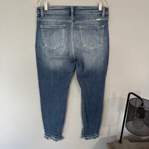 Kancan Skinny Mid Rise Frayed Ripped Jeans in Women's Size 30. Ankle Length, Cotton, Polyester, & Spandex blend. Jeans have a cute, distressed look w raw hems, annd are in good used condition with no flaws or stains other than some minor wash wear. Please see close-up pictures for condition details.