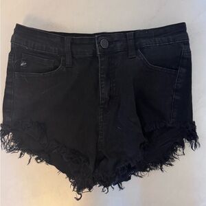Experience the perfect blend of style and comfort with these KanCan high-waisted shorts. Crafted in sleek black denim, they feature a trendy distressed, frayed hem for a chic, modern look. Ideal for versatile styling, these shorts are a must-have addition to your wardrobe.