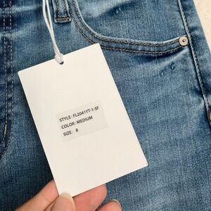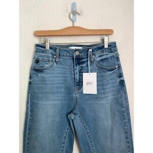 New with tags Kancan Jeans, presenting a harmonious blend of style and comfort. These light wash denim jeans feature a flattering high rise that accentuates the waist and extends into a trendy flare leg, creating a balanced silhouette. Designed with a classic five-pocket styling, they offer both functionality and a timeless aesthetic. The jeans showcase meticulous stitching details throughout, adding to their refined look. These Kancan jeans combine stretch denim to ensure a flexible fit, perfect for all-day wear.