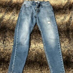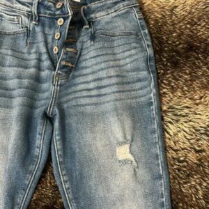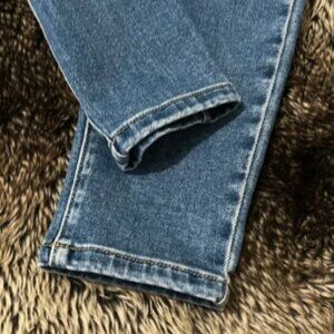 Like new. No flaws. Smoke free home. Fabric content shown in photo. Button fly. Light wash. Skinny leg. Inseam 27 inches. Slight destroyed style.