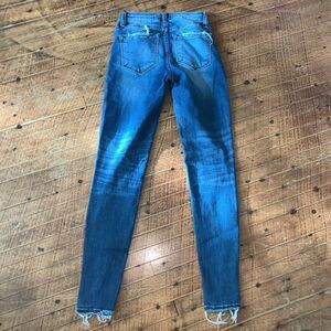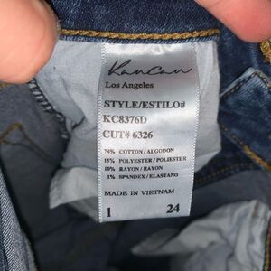 Kancan distressed, raw hem, stretchy, normcore, ankle jeans. Pairs well with a flowy top or button down top. Approximately 12 inches across the waist, 8.5 inch rise, and 28.5 inch rise. A spot on one leg. Overall, in good condition. From a pet and smoke free home.