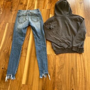 Sz 0/23 kancan jeans with 29” inseam, and sz med American Eagle sweatshirt. Both come with this bundle.