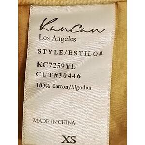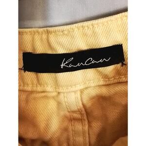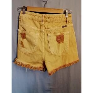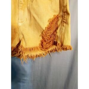 Kancan destressed yellow short shorts. Color on photo is correct on yellow color however dark brown is a lighting error. All over color is yellow.