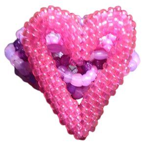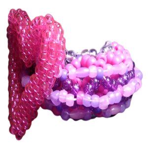 I have crafted a special gift for you using clear pink mini-pony beads: a heart, just in time for Valentine's Day. It's attached to a 3D Kandi Cage Cuff, which I made with pink and purple pony beads, including some that glow in the dark. This would make a perfect present for your special Valentine.