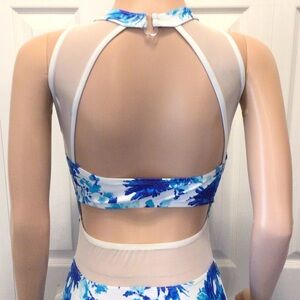 Kandi Kouture Blue Floral Sleeveless Sheer Panel Halter Dance Leotard Size TM. Very good condition with the exception for tiny color stain spots on back sheer panel. Not noticeable and may come out with color stain remover. I didn’t try. See last photos. From smoke free home.