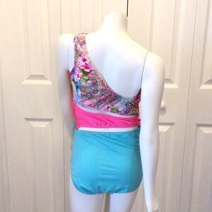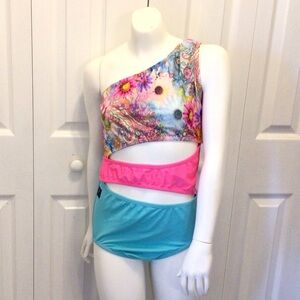 Kandi Kouture Cut Out Neon Floral Colorblock One Shoulder Dance Leotard Size AM