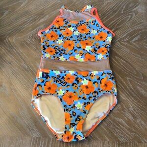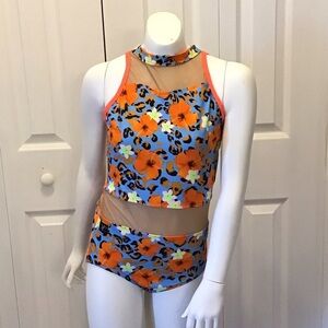 Kandi Kouture Orange Floral Leopard Print Mesh Panel Dance Leotard Size TM