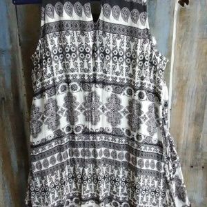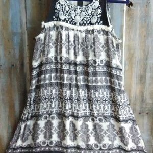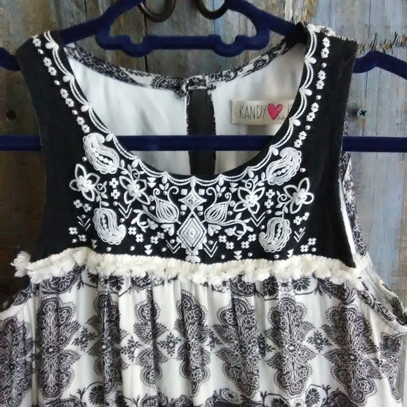 Paisley abstract black and cream print fully lined boho dress with small silver studded accents, embroidery and fringe on bodice. Button closure on back. Dress up or down. Size 7/8.