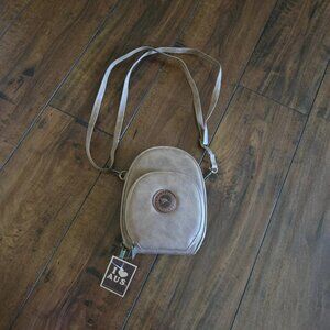 The Kangaroo Australia Crossbody Bag is a brown leather featuring a brass zip closure and brown faux leather straps.