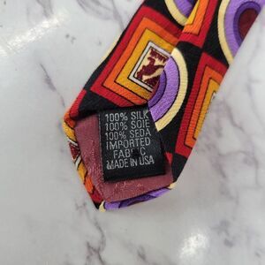 Vibrant tie with geometric patterns. Features red, orange, and purple designs with kangaroo silhouettes.