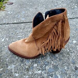 Cognac, suede boot with stacked heel, fringe detail and a side zip.