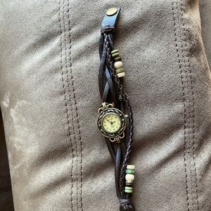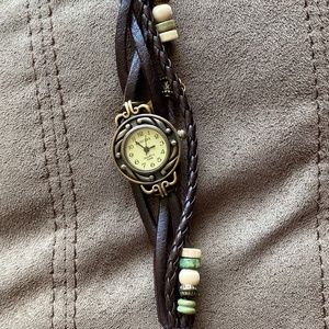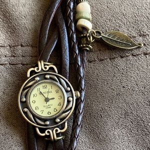 Brown Genuine Leather Vintage Quartz Layered Bracelet Watch with leaf charm and accent beads. Antique gold dial hardware. Approx 8" long Multi snap closure makes this adjustable for various wrist sizes.