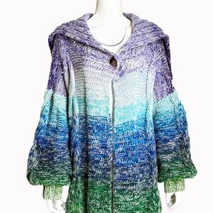 Make a bold statement in this rare vintage knit by visionary Japanese designer Kansai Yamamoto—a true icon of 1970s avant-garde fashion. Crafted from a chunky wool/mohair/nylon blend, it features a vibrant rainbow palette, voluminous shawl collar, roomy side pockets, and intricate cable knit detailing. A single button at the collar allows it to drape effortlessly, whether worn open or fastened.