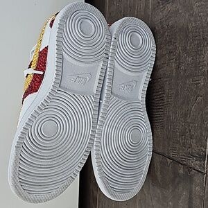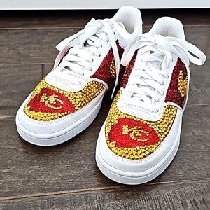 Custom Kansas City Chiefs Nike Court Vision Low Next Nature Sneakers with KC Arrowhead on Top of Toe. Gold and Red Gems with a Gold Swoosh. Chiefs Name on Back of Heel. Very Cool and Great for the Games and the Dedicated Fan. One Gold Gem Missing. In Great Shape and will be a Collectors Item!