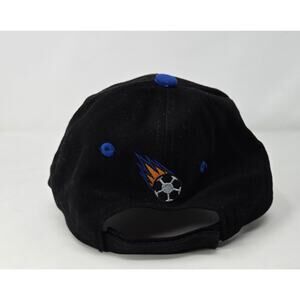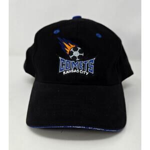 This is a lot of 3 Kansas Sports teams hats that are from the late 1990s and early 2000s that were game giveaway items. They have not been worn and are in new condition. The first is a black Kansas City Comets hat in black with blue accents. The second is a Kansas City Comets blue adjustable visor that was a gameday giveaway. The last is a Kansas City Attack black adjustable hat.