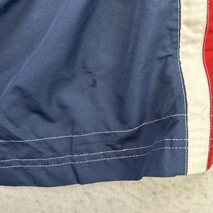 Kansas Jayhawks Swim Trunks Mens Small S Blue Red Mesh Lined Drawstring Swimwear. It is pre owned in good condition with some wear. There is a hole on the back. Please see pictures. All measurements are approximate and done on a flat surface which can be seen in Pictures.