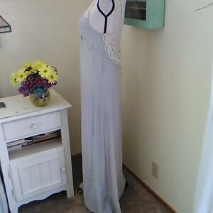 Silvery maxi in a crinkly rayon blend fabric with a little sheen. Fully lined. Wrap front, elastic under chest. Lace at shoulders, see last photo ( some slight loosening in a small space) and down the back where YOU show through. Size S/0 measures 32 at chest, 30 under chest, 36 at hips, 58 long from shoulder to hem. Beautiful!