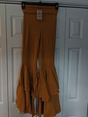 Mustard pants with dramatic ruffled hems from Kantha Bae. Soft stretch fabric for all-day comfort. High-rise style that flatters the waist. Perfect hippie vibe. Size L/XL