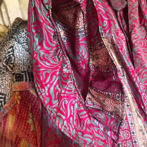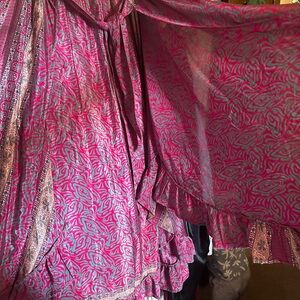 Flowy bohemian maxi dress with vibrant patterns. Features a mix of pink, green, and purple hues.