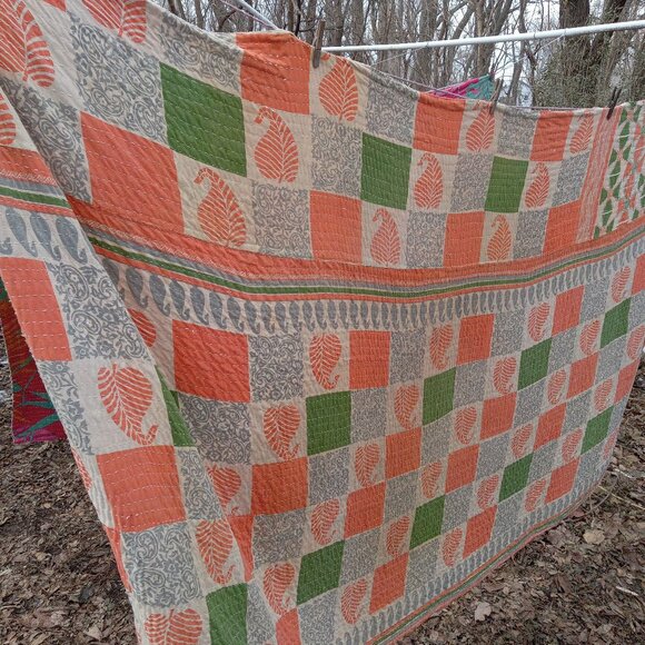 Kantha Quilt Orange Green Squares 54" x 89" Premium 3 Layer Cotton K60.