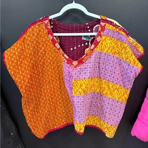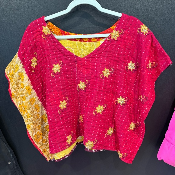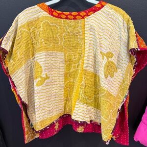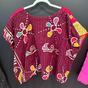 Hand crafted and sewn by families in India providing work and a fair wage. The fabric has lived a full life before becoming these designs. kantha clothing is made using vintage Indian cotton fabrics, there may be very small repairs, patches, threads, holes, marks or pattern/ dye inconsistencies. These fabrics are created from cotton saris that have lived a previous life. Each item is one of a kind and full of character! 💜
