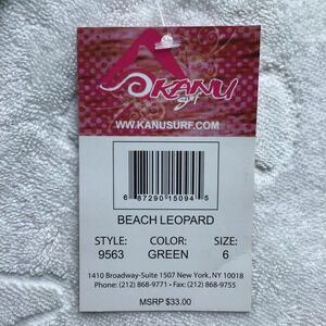 Kanu Surf Green Beach Leopard Tankini Set. Size 6. Made of a nylon/spandex blend. The lining is 100% polyester. New with tags. Smoke free home.