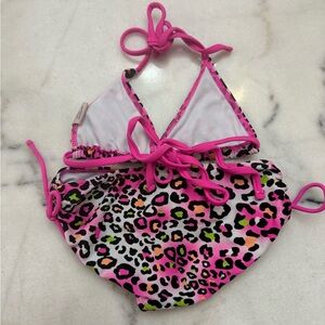 Vibrant pink leopard print bikini set. Features a stylish halter top and matching bottoms. Good Used Condition