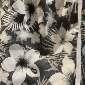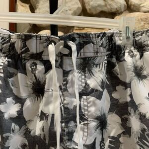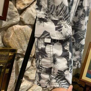 Gently worn Kanu surf swim/surf/board shorts. Tie waist, two side, cargo pockets, gray, and white tropical floral design. Size XXL