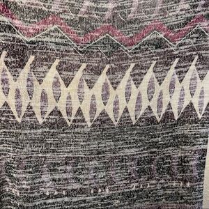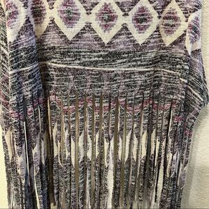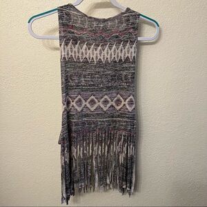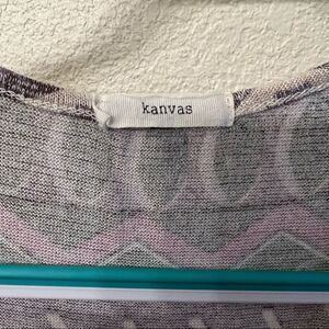 This fun top is from Kanvas. It has a boho look with the frills at the bottom and it’s geometric patterns. The top is sleeveless. The label of what material the top is made of is missing. The item has a feel of cotton. The label of size has also been removed for comfort. The measurements are 27” L x 23” W (pit to pit). This top has been gently worn but is in great condition.