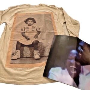 The Kanye West "DONDA" 2021 Concert T-Shirt in tan, size L, is a must-have for fans of the iconic rapper. Made by Gildan, this regular fit shirt features long sleeves, making it perfect for a concert or casual wear. The music-themed design is a stylish way to remember Kanye's Atlanta tour. Shirt is brand new, never worn, no tags.