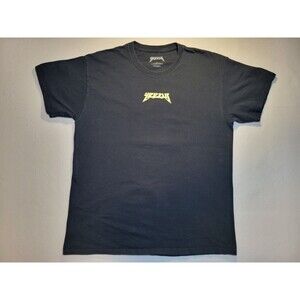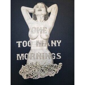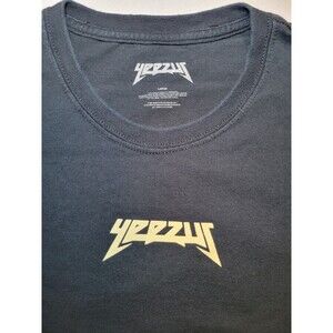 The Kanye West Yeezus One Too Many Morning Shirt in size L features a graphic print designed by Wes Lang, showcasing nude women and skulls. This black T-shirt with a crew neckline and short sleeves is made of cotton, providing a comfortable regular fit for men. It is double-sided and bears the Yeezus brand logo, reflecting the edgy and artistic style associated with Kanye West's aesthetics.