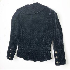 KAOS By Andy John’s black velvet quilted jacket, with zip and button closure, does have shoulder pads and has buttons on the cuffs.