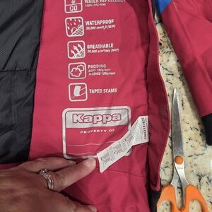 Vibrant raincoat with red, yellow, and blue stripes. Features iconic Kappa logo. Perfect for rainy days.