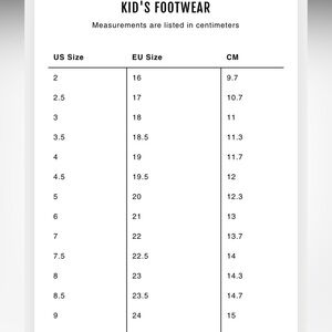 Shoe guide looks to match size 8 cm says faintly 14.3cm . Looks like it could also fit a size 7.5 toddler size compared to another brand of shoe I have. adjustable straps see measurements I posted