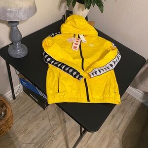 Vibrant yellow raincoat for teens or men. Features iconic Kappa logo on sleeves one black with white and one white with black. Stylish and functional this jacket will keep you and all your things dry when it’s pouring outside. It’s a nice rain jacket and fits really well if you’re a small. This also has a pouch inside the jacket that’s you can fold the jacket up into and pack it into a little square. You also can use that same pouch for a phone or wallet and it’s like a hidden pocket while wearing it since the zipper is on the inside. Great jacket for people that like style and like different pieces that stand out. Kappa brand always makes quality clothing.