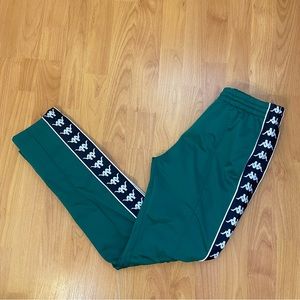 Kappa Men’s Logo Green Soccer Pants Small. Green, drawstring pants. Two side pockets. Navy blue and white Kappa logo down side seams of pants. Kappa logo on front right leg. Tapered legs. Thread pulls on back of right lower calf as shown in photo. Size Small.