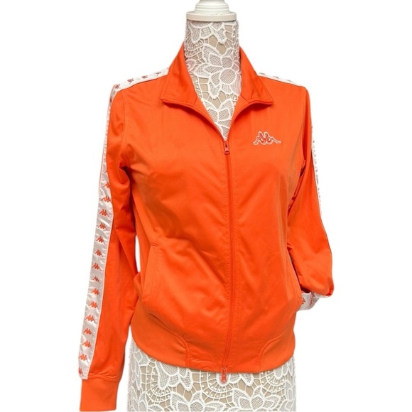 Keywords: Kappa track jacket, orange jacket, logo sleeve jacket, retro track jacket, streetwear jacket, Kappa medium, lightweight jacket, casual layering, logo detail jacket, sporty jacket, vintage-inspired jacket, athleisure wear, embroidered logo jacket, statement jacket, orange activewear, comfortable jacket, bold color jacket, classic Kappa, zip-up jacket, sporty street style, all-season jacket, orange Kappa jacket, track suit top, stylish athleisure, tape detail jacket
