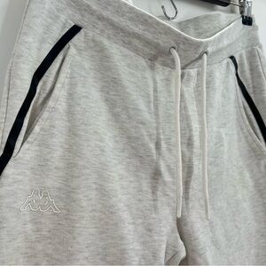 Kappa grey sweatpants with black banding at the hem and pockets. Size large, featuring kappa logo on front by pocket.