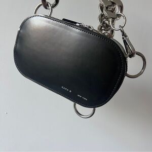 Black curb chain crossbody bag by Kara New York. Convertible chain strap, zipper closure, card slots inside, lined interior.