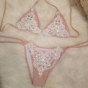 Sexy soft pink fabric overlayed with white lace and glittery beads. Self tie at top, back and sides for a fully adjustable fit.