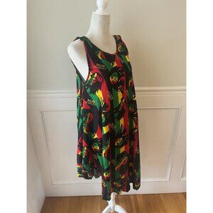 This vibrant Karan Bob Marley swing dress offers a comfortable and relaxed fit. Crafted from lightweight rayon, it features iconic imagery of Bob Marley in a lively multicolor pattern, making it a standout piece for casual wear.