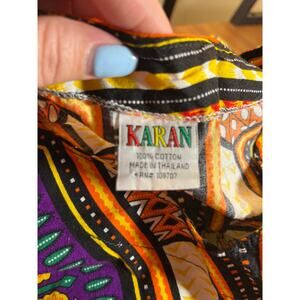 Bold and vibrant, this Karan 100% cotton dashiki-style shirt works perfectly as a lightweight top or beach cover-up. Features a striking tribal print in purple, yellow, and orange with a drawstring waist and wide sleeves. No size tag, best fits US women's 2X (18W–20W); please see measurements for accurate fit. Excellent for festivals, lounging, or coastal boho style.