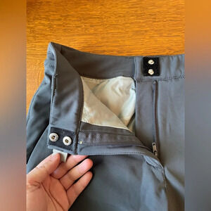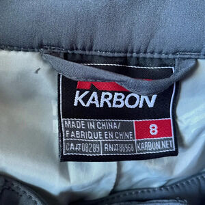 you have these Karbon snow pants! They are in great condition. Hand wash. Made of 94% polyester/6% spandex. Lining is 100% polyester. Zippered front fly with two snap closure. Zipper hand pockets. Belt loops. Inner elasticized snow cuff with snap and Velcro closure. Dark gray color. Warm!! Size 8 (check measurements in photos or below). You want to be warm and look cool doing it? Look no further! There is what appears to be a pen mark on the front left belt loop (last pic) and the left knee area has some minor pilling (second to last photo). No other noted flaws; great condition!